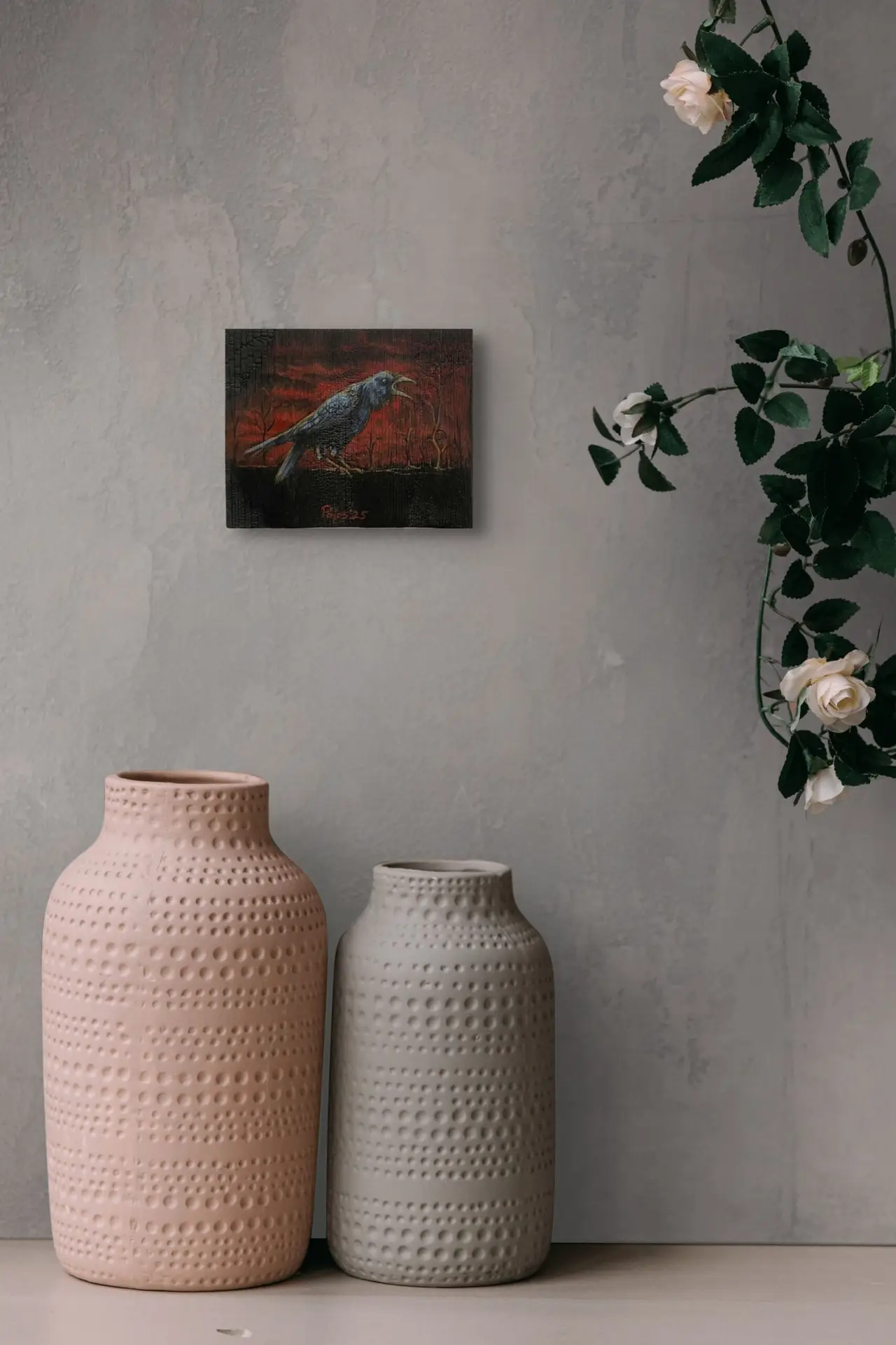 “The One Who Knows 2” is a mystical raven painting from the Valgelind (White Bird) series, showing the bird in a glowing, firelit forest. The piece is painted in acrylic on burned wood and finished with subtle golden highlights.